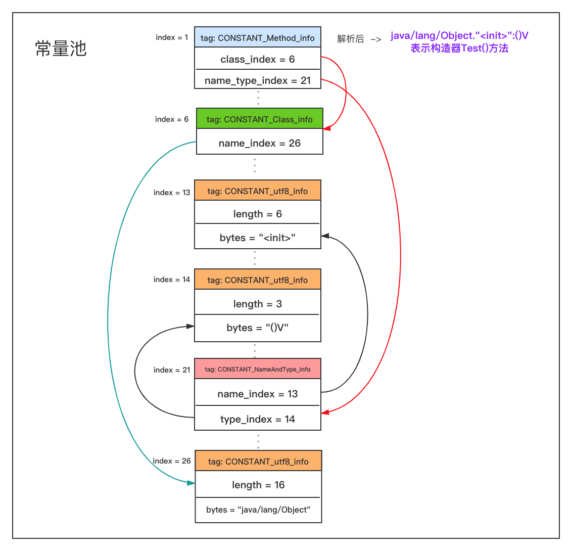 仔细解析层层引用,最后我们可以看出,Test.class文件中常量池的第1个常量保存的是Object中的默认构造器方法。
