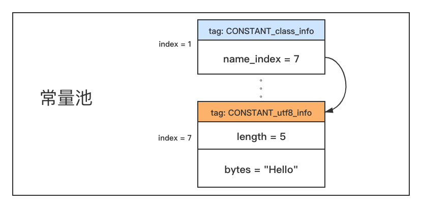 - name_index:是一个索引值,可以将它理解为一个指针,指向常量池中索引为name_index的常量表。比如name_index = 2,则它指向常量池中第2个常量。